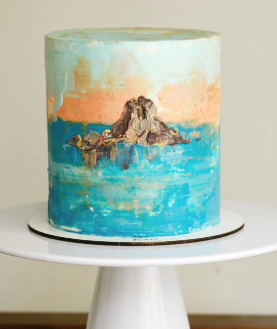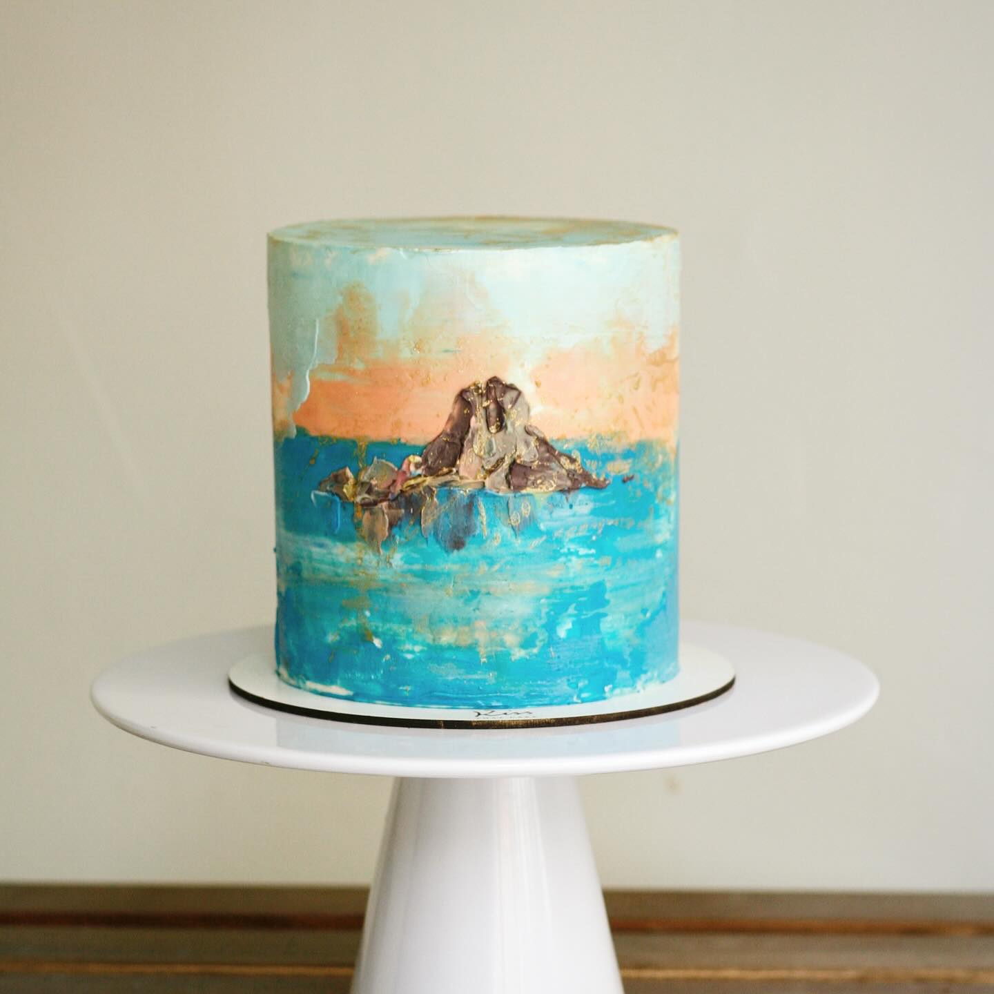 Tarta pintada a mano de Es Vedrà. Diseño fijo, sin modificaciones.